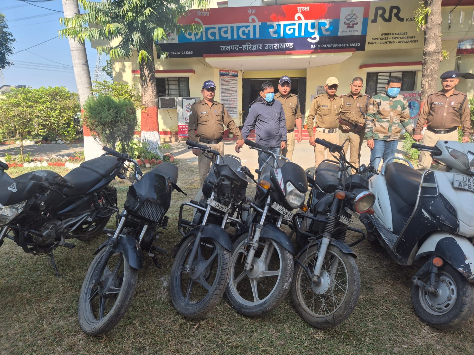 जानकारी के अनुसार पिछले दिनों शिवालिक नगर से अज्ञात चोर द्वारा पल्सर बाइक चोरी कर ली गयी थी। मामले में वाहन स्वामी प्रिन्स चौहान की शिकायत पर कोतवाली रानीपुर में मुकदमा दर्ज कर लिया गया था। वहीं बैरियर नं. 6 के पास से अजय सिंह अधिकारी की पल्सर मोटर साइकिल चोरी होने के संबंध में प्राप्त शिकायत के आधार पर कोतवाली रानीपुर में मुकदमा दर्ज कर जांच शुरू कर दी गयी। वहीं मुबारिक अली निवासी महदूदपुर पिरान कलियर की मोटर साइकिल स्प्लेण्डर को अज्ञात व्यक्ति ने सेक्टर—4 पीठ बाजार से चोरी कर लिया गया। जिसकी शिकायत पर भी कोतवाली रानीपुर में मुकदमा दर्ज कर चोरों की तलाश शुरू कर दी गयी। लगातार एक के बाद एक दोपहिया वाहनों की चोरी होने की शिकायतों पर पुलिस के आलाधिकारियों ने टीम का गठन कर आरोपियों की तलाश शुरू कर दी गयी। पुलिस टीमों के लगातार प्रयासों के पश्चात बीती शाम पुलिस टीमों ने एक सूचना के आधार पर न्यू शिवालिक नगर टिहरी विस्थापित रपटे के पास से दो संदिग्धों को गिरफ्तार कर उनके कब्जे से चुरायी गयी दो पल्सर बाइक बरामद की। पूछताछ में उन्होने अपना नाम सुमित चौहान पुत्र देवेन्द्र निवासी ग्राम अतरौली थाना भोजपुर जनपद गाजियाबाद व अजीजुर्रहमान उर्फ रहमान मलिक पुत्र अब्दुल वाहिद निवासी नालापार मोरीगेट थाना शहर कोतवाली जनपद रामपुर उ.प्र. बताया। बताया कि वह मास्टर—की की मदद से अलग—अलग जगहों से दोपहिया वाहन चोरी करते थे और चोरी की गाड़ियो को डिमांड आने पर इन्हें मुरादाबाद के रास्ते खटीमा होते हुये जंगल के रास्तो से नेपाल ले जा कर मंहगे दामों में बेचते थे। चैकिंग के दौरान बरामद दोनों पल्सर मोटरसाइकिलों को भी नेपाल ले जाया जा रहा था। पुलिस ने आरोपियो की निशांदेही पर ज्वालापुर से नहर पटरी स्थित एक खण्डहर पड़े भवन के अन्दर से 8 अन्य चोरी की मोटर साईकिले/स्कूटी बरामद की गई जिनमें कोतवाली रानीपुर, कोतवाली ज्वालापुर व थाना सिड़कुल क्षेत्र से चोरी किए गए दोपहिया वाहन भी शामिल हैं।