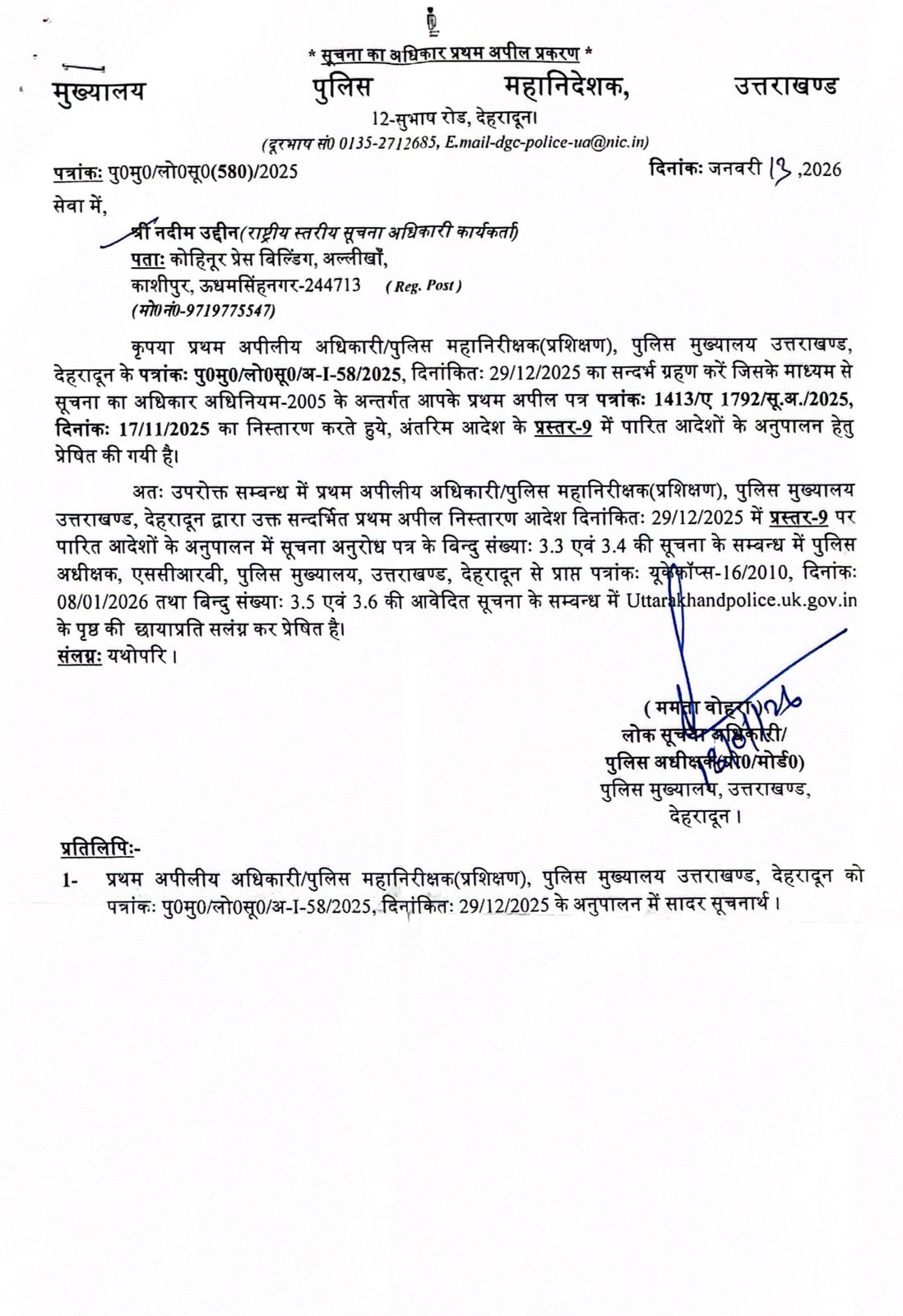 काशीपुर निवासी सूचना अधिकार कार्यकर्ता नदीम उद्दीन (एडवोकेट) ने उत्तराखंड पुलिस मुख्यालय के लोक सूचना अधिकारी से उत्तराखंड के सभी थानों के थाना प्रभारी/प्रभारी निरीक्षकों के कार्यालयों की ई—मेल आई.डी. की सूची जिन पर ई—मेल भेजकर एफ.आई.आर. दर्ज करायी जा सकती हैं, की सूचना चाही थी। इसके उत्तर में लोक सूचना अधिकारी/पुलिस अधीक्षक (प्रो0/मोर्ड0) ममता वोहरा ने अपने पत्रांक 580 के साथ पुलिस अधीक्षक एस.सी.आर.बी. विशाखा अशोक भदाणे के पत्रांक 16/2010 की प्रति उपलब्ध करायी है। उपलब्ध सूचना के अनुसार उत्तराखंड के सभी थानों के थाना प्रभारी/प्रभारी निरीक्षकों के कार्यालयों की ई—मेल आई.डी. जिन पर ई—मेल भेजकर एफ.आई.आर. दर्ज करायी जा सकती है, उत्तराखंड पुलिस की वेबसाइट पर उपलब्ध है।